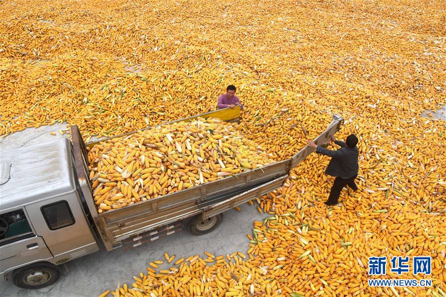 10月8日,山東省沂南縣大莊鎮(zhèn)溝崖村家庭農(nóng)場的工人在曬場上搬卸剛收獲的玉米。