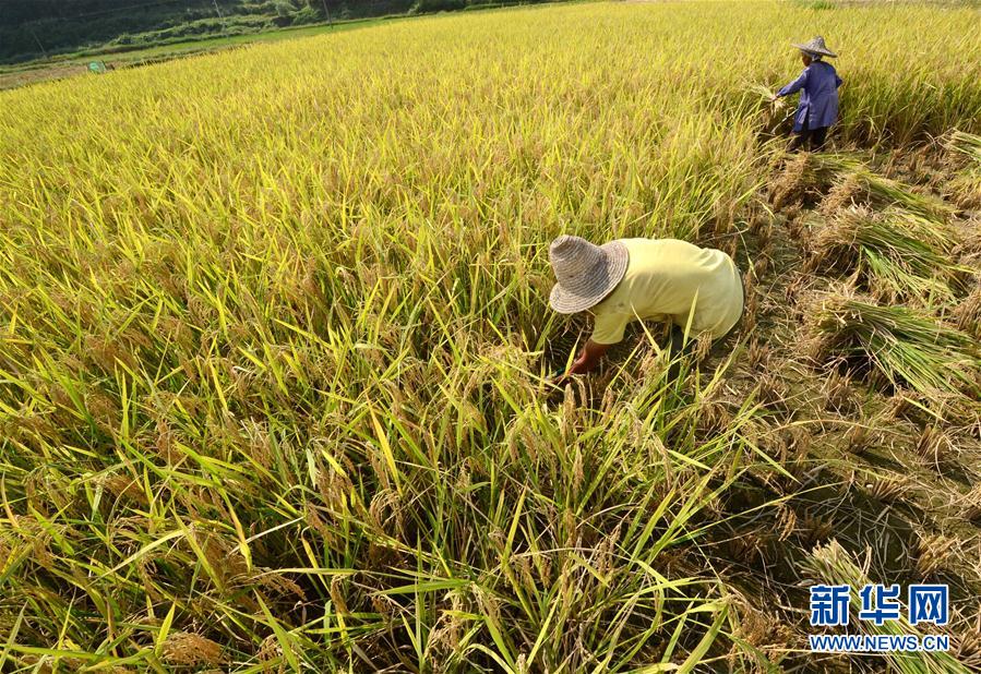 10月8日,貴州榕江縣忠誠鎮(zhèn)農(nóng)民在收獲水稻。
