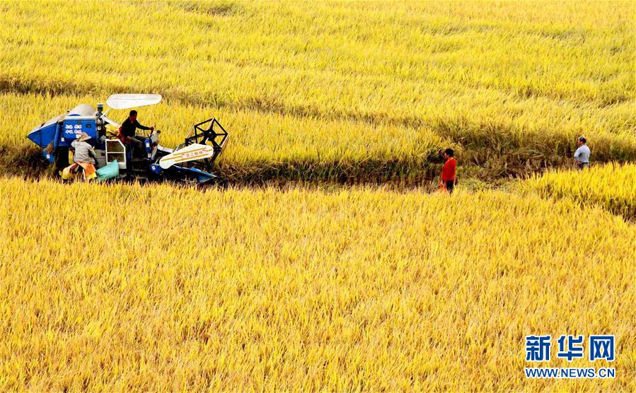 10月8日,安徽省巢湖市中垾鎮(zhèn)建華村農(nóng)民在收割水稻。寒露時節(jié),各地水稻、玉米等農(nóng)作物陸續(xù)進入收獲期。