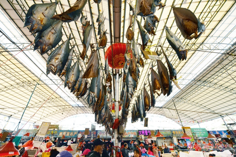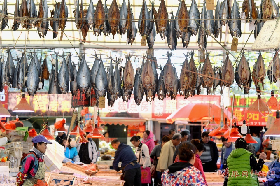 青島日?qǐng)?bào)/青島觀/青報(bào)網(wǎng)訊 青島是濱海城市,海鮮對(duì)于青島人來說可是最具誘惑力的美味,吃海鮮講究一個(gè)鮮,可是在鮮之外,還有另一種誘人的味道,這就是香。2017年10月23日,山東省青島市,秋鲅魚大量上市進(jìn)入晾曬季節(jié),市民開始在市場(chǎng)上選購(gòu)鲅魚制作成美味魚干食用,或作為禮物送給親朋好友。懸掛在市場(chǎng)上的“空中美味”散發(fā)著花椒和魚的鮮香,成為一道民俗風(fēng)景。