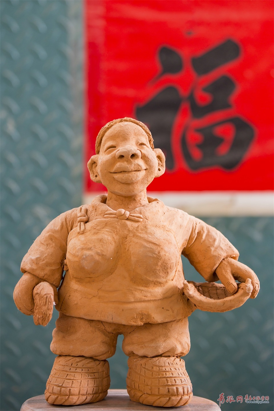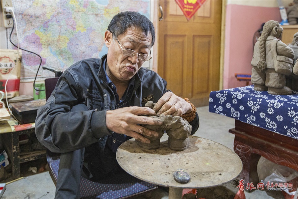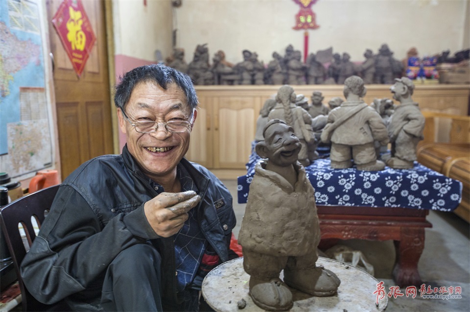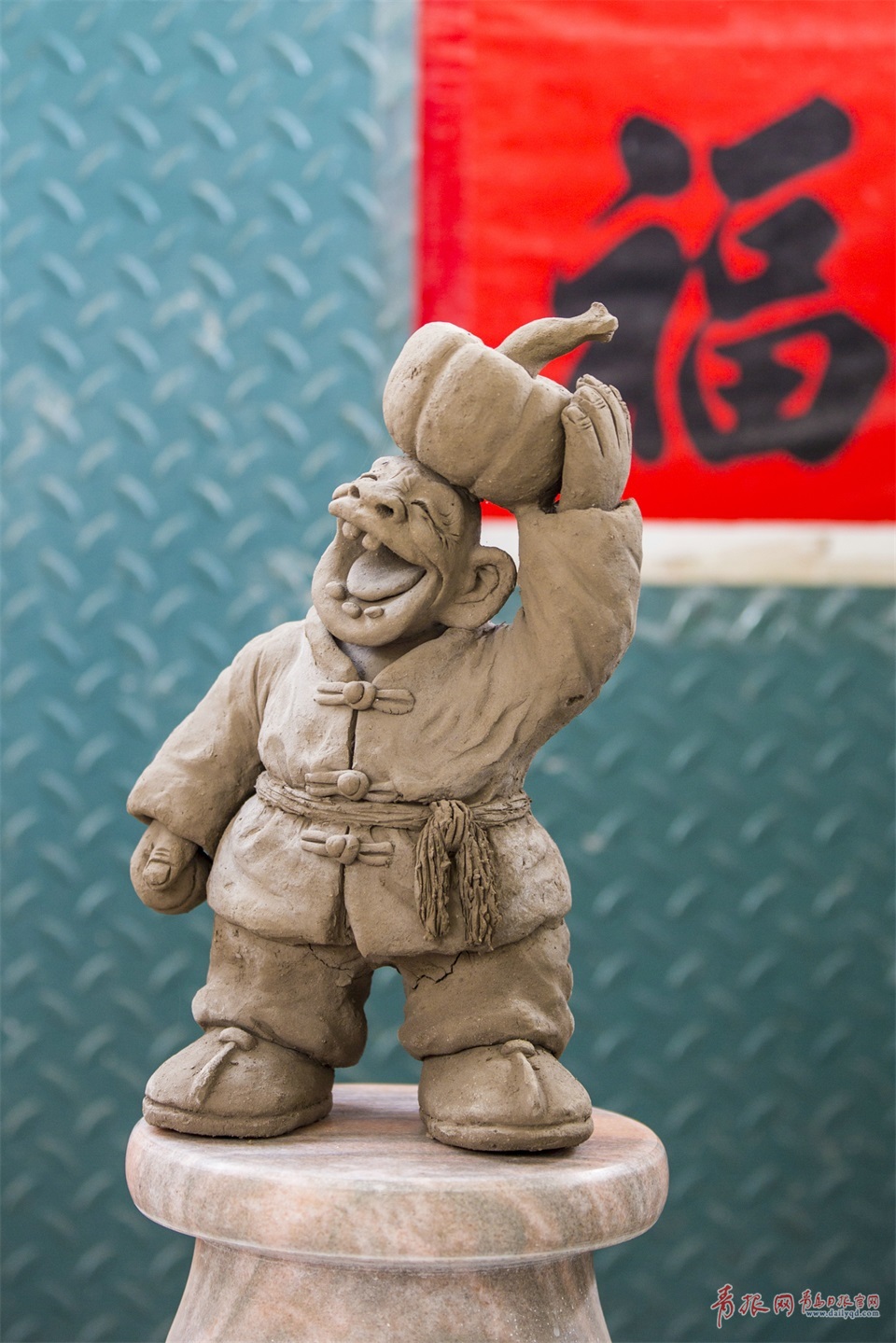 荊寶海1歲時(shí)因患小兒麻痹癥導(dǎo)致雙腳萎縮,行動(dòng)不便。為了能養(yǎng)家糊口,8歲時(shí),荊寶海開始跟著爺爺學(xué)習(xí)祖?zhèn)鞯哪嗨苁炙?。雖然行動(dòng)不便,但荊寶海心靈手巧,很快就能自己制作泥塑了?!耙婚_始是學(xué)著捏一些簡(jiǎn)單的泥哨和泥人,拿到集上,能換點(diǎn)地瓜干?!毕肫饎傞_始學(xué)習(xí)制作泥塑時(shí)的情境,荊寶海說,當(dāng)時(shí)泥塑只是用來養(yǎng)家糊口的手藝。