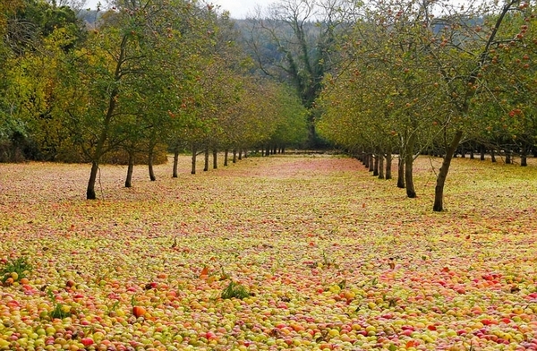 蘋果齊整地鋪滿果園地面,蔚為奇觀。